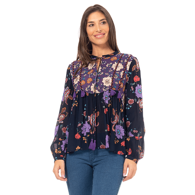 Blusa estampada con cuello mao amarrado. Blusa Multicolor con trenzas y pompones en la parte delantera.