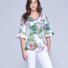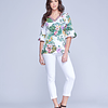 Top de estampado floral de algodón lycra cuello en V con mostacillas de color bordadas, Mangas volantes. Cierre lateral.