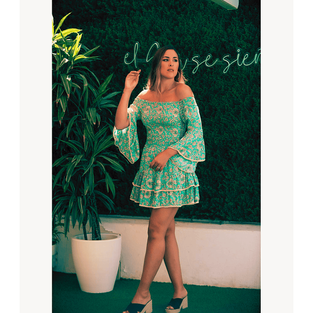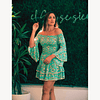¡Este hermoso vestido corto es una joya digna de brillar en tu guardarropa! Con su cuerpo elasticado, te brindará el ajuste perfecto para realzar tu figura de una manera cómoda y elegante. El estampado turquesa, decorado con delicadas flores beige y adornos dorados, le añade un toque de frescura y sofisticación a esta prenda.Además, cuenta con un volante asimétrico en la manga de capa, que le otorga un toque de originalidad y romanticismo. La faldita está terminada con dos volantes, creando un movimiento ligero y femenino al caminar. Y para darle ese toque final, las terminaciones están decoradas con borlitas, agregando un detalle encantador a este vestido. Confeccionado con una lujosa mezcla de 70% poliéster y 30% seda.